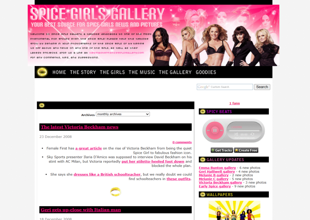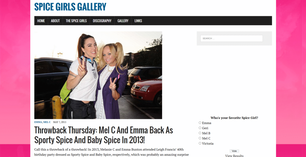 SpiceGirlsGallery.com was first launched in 2007, the year the Spice Girls first reunited. It seemed like a good time as any to launch a Spice Girls fansite. We really only wanted to document what each Spice Girl was doing and to be on the lookout for any rumblings of a reunion. Plus, we had so many pictures we collected over the years, from scans to random downloads, that we needed somewhere to put them.